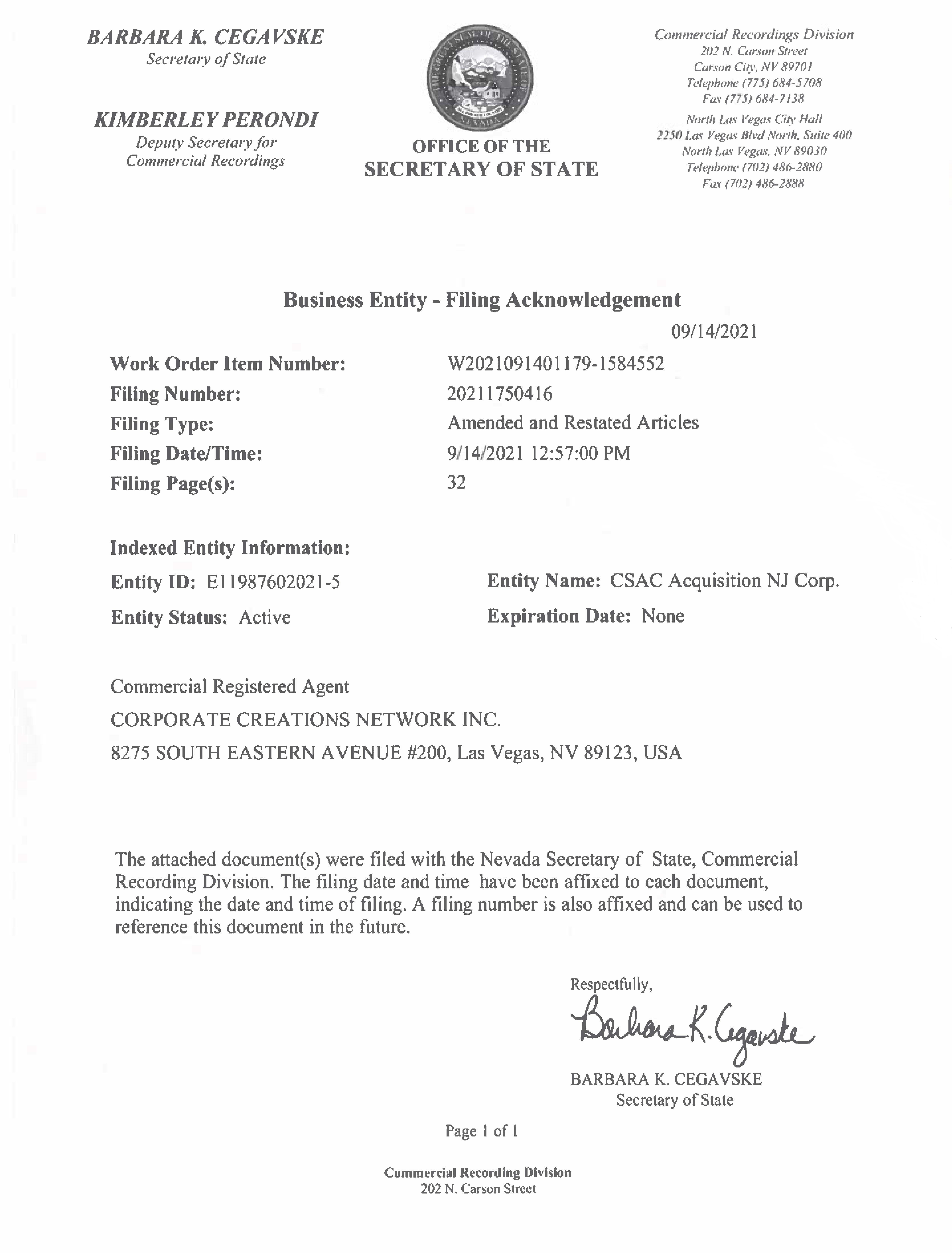 BARBARA K. CEGA VSKE Secreta,y of Stale KIMBERLEY PERONDI Deputy Secretary for Commercial Recordings OFFICE OF THE SECRETARY OF STATE Commercial Recordings Division 202 N. Carson Street Carson City, NV 89701 Te/epho11e (775) 684-5708 FllY (775) 684-7138 North las Veg”-’ City Hall 11:50 la< Vegas Bfrd North. Suite 400 North LCI.< Veg”-’· NV 89030 Telep/1011,· (702) 486-2880 Fm (702) 486-2888 Business Entity - Filing Acknowledgement 09/14/2021 Work Order Item Number: Filing Number: Filing Type: Filing Date/Time: Filing Page(s): Indexed Entity Information: Entity ID: E 11987602021-5 Entity Status: Active Commercial Registered Agent W202l09l40ll79-l584552 20211750416 Amended and Restated Articles 9/ 14/2021 12:57:00 PM 32 Entity Name: CSAC Acquisition NJ Corp. Expiration Date: None CORPORA TE CREATIONS NETWORK INC. 8275 SOUTH EASTERN AVENUE #200, Las Vegas, NV 89123, USA The attached document(s) were filed with the Nevada Secretary of State, Commercial Recording Division. The filing date and time have been affixed to each document, indicating the date and time of filing. A filing number is also affixed and can be used to reference this document in the future. Respectfully, BARBARA K. CEGAVSKE Secretary of State~K.~ Page 1 of 1 Commercial Recording Division 202 N. Carson Street