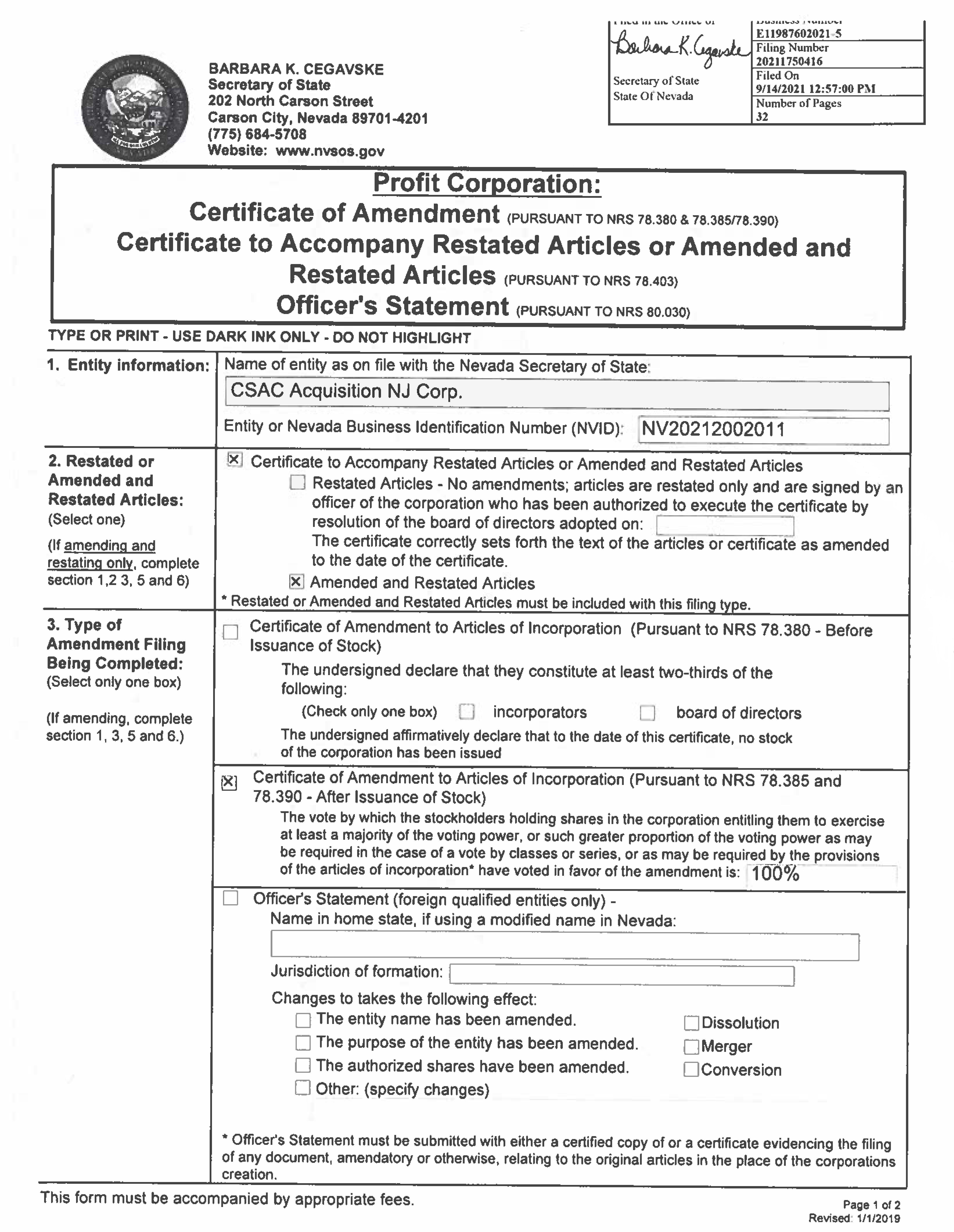 accompanied by appropriate fees. Page4 of2 Revised: 1/1/2019 23-24183-2 C1.3 P244 BARBARA K. CEGAVSKE Secretary of State 202 North Carson Street Carson City, Nevada 89701-4201 (775) 684-5708 Website: www.nvsos.gov Profit Corporation: E 11987602021-5 Filing Number .....,.__,-‘I 20111750416 Secretary of State Stale OfNe\‘ada Filed On 9/14/1021 12:57:00 PM Number of Pages 32 Certificate of Amendment <PuRsuANTTo NRs 1s.3ao& 1s.3ssne.3so> Certificate to Accompany Restated Articles or Amended and Restated Articles (PuRsuANrro NRs 1e.4o3> Officer’s Statement (PuRsuANT rn NRs ao.030> TYPE OR PRINT - USE DARK INK ONLY - 00 NOT HIGHLIGHT 1. Entity information: Name of entity as on file with the Nevada Secretary of State: j CSAC Acquisition NJ Corp. I Entity or Nevada Business Identification Number (NVI0)’. :NV20212002011 I 2. Restated or [gJ Certificate to Accompany Restated Articles or Amended and Restated Articles Amended and 0 Restated Articles - No amendments; articles are restated only and are signed by an Restated Articles: officer of the corporation who has been authorized to execute the certificate by (Select one) resolution of the board of directors adopted on: [ =1 (If amending and The certificate correctly sets forth the text of the articles or certificate as amended restating onl~, complete to the date of the certificate. section 1,2 3, 5 and 6) ~ Amended and Restated Articles * Restated or Amended and Restated Articles must be included with this filing type. 3. Type of □ Certificate of Amendment to Articles of Incorporation (Pursuant to NRS 78.380 - Before Amendment Filing Issuance of Stock) Being Completed: The undersigned declare that they constitute at least two-thirds of the (Select only one box) following: (If amending, complete (Check only one box) 0 i nco rpo raters 0 board of directors section 1, 3, 5 and 6.) The undersigned affirmatively declare that to the date of this certificate, no stock of the corporation has been issued ~ Certificate of Amendment to Articles of Incorporation (Pursuant to NRS 78.385 and 78.390 - After Issuance of Stock) The vote by which the stockholders holding shares in the corporation entitling them to exercise at least a majority of the voting power, or such greater proportion of the voting power as may be required in the case of a vote by classes or series, or as may be required by the provisions of the articles of incorporation* have voted in favor of the amendment is: f0-0¾ □ Officer’s Statement (foreign qualified entities only) - Name in home state, if using a modified name in Nevada: I I Jurisdiction of formation: I I Changes to takes the following effect: □ The entity name has been amended. D Dissolution D The purpose of the entity has been amended. □ Merger D The authorized shares have been amended. □Conversion 0 Other: (specify changes) * Officer’s Statement must be submitted with either a certified copy of or a certificate evidencing the filing of any document, amendatory or otherwise, relating to the original articles in the place of the corporations creation. This form must be accompanied by appropriate fees. Page 1 of 2 Revised: 1/1/2019