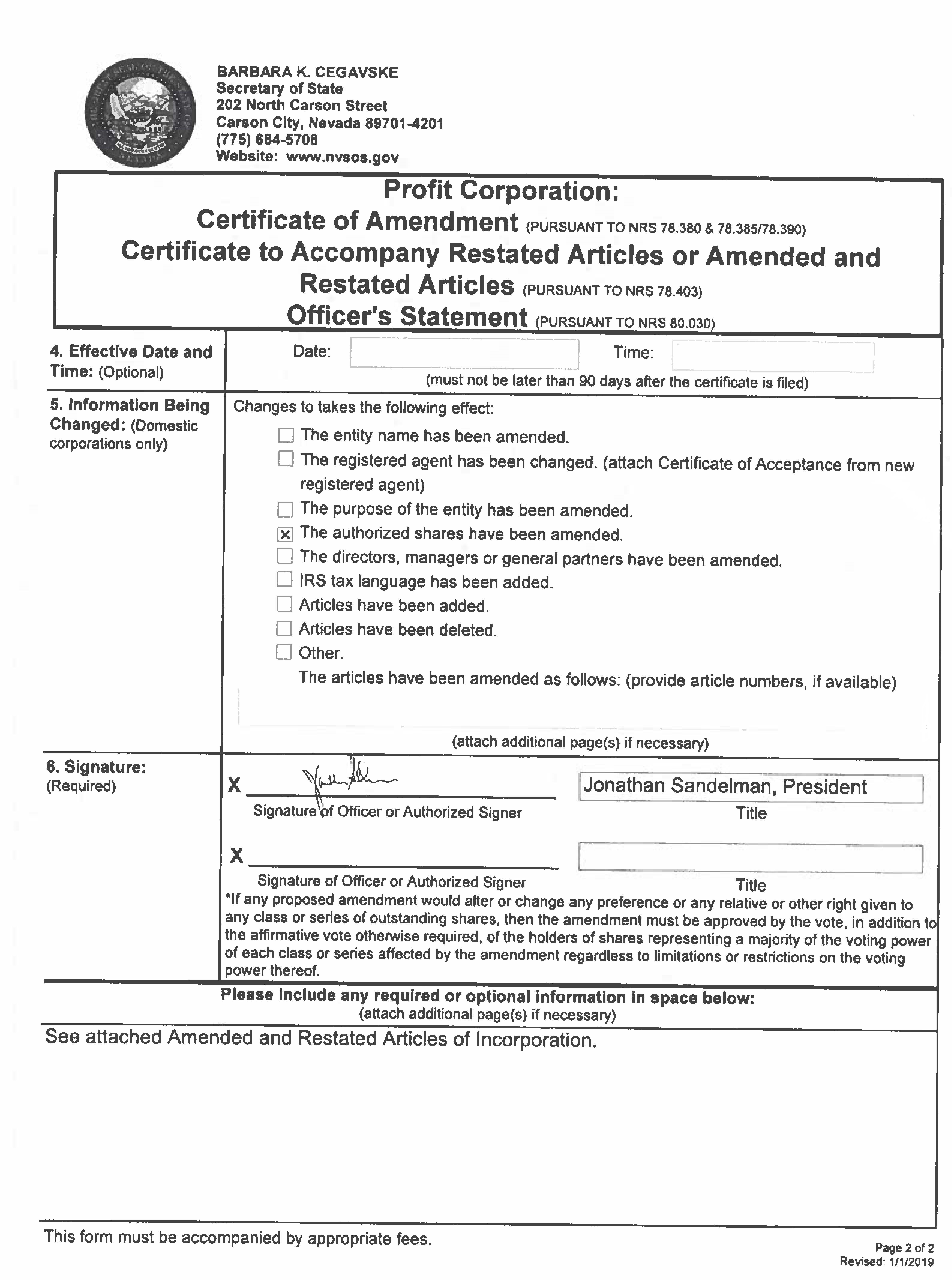accompanied by appropriate fees. Page 2of2 Revised: 1/1/2019 23-24183-2 C1.3 P245 BARBARA K. CEGAVSKE Secretary of State 202 North Carson Street Carson City, Nevada 89701-4201 (775) 684-5708 Website: www.nvsos.gov Profit Corporation: Certificate of Amendment <PuRsuANTro NRs 1a.38o& 18.385178.390> Certificate to Accompany Restated Articles or Amended and Restated Articles <PuRsuANT To NRs 1s.4o3> 4. Effective Date and Time: (Optional) 5. Information Being Changed: (Domestic corporations only) 6. Signature: (Required) Officer’s Statement PuRsuANTTo NRs ao.030 Date: Time: (must not be later than 90 days after the certificate is filed) Changes to takes the following effect: D The entity name has been amended. D The registered agent has been changed. (attach Certificate of Acceptance from new registered agent} □ The purpose of the entity has been amended. [Bl The authorized shares have been amended. D The directors, managers or general partners have been amended. D IRS tax language has been added. D Articles have been added. D Articles have been deleted. 0 Other. The articles have been amended as follows: (provide article numbers, if available) (attach additional page(s) if necessary) x ____j ~μL.-~---- signature’b, Officer or Authorized Signer IJonat~an Sandelman, President Title x ____________ _ Signature of Officer or Authorized Signer Title •1t any proposed amendment would alter or change any preference or any relative or other right given to any class or series of outstanding shares, then the amendment must be approved by the vote, in addition to the affirmative vote otherwise required, of the holders of shares representing a majority of the voting power of each class or series affected by the amendment regardless to limitations or restrictions on the voting power thereof. Please include any required or optional Information In space below: (attach additional page(s) if necessary) See attached Amended and Restated Articles of Incorporation. This form must be accompanied by appropriate fees. Page 2 of 2 Revised: 1/1/2019